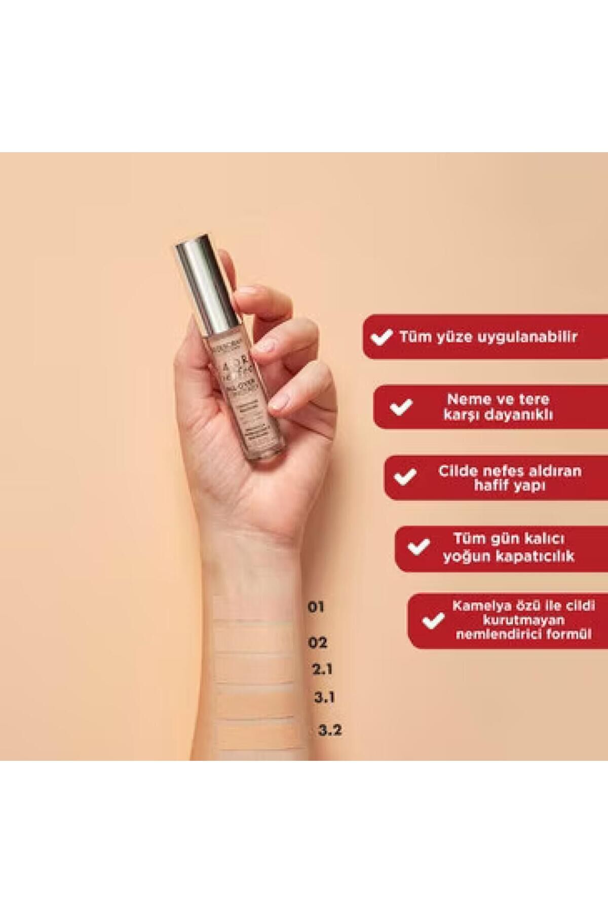 Cilt bakım içerikleriyle zenginleştirilmiş yeni sıvı kapatıcı. ; 24 saate kadar kalıcı ve suya dayanıklı ultra kapatıcı. ; Doğal görünen ultra hafif dokusuyla yeni sıvı formül cilt kusurlarının, göz altı torbalarının ve cilt tonu eşitsizliklerinin görünümünü azaltır. ; Hyalüronik asit ve yeşil çay içeriğiyle zenginleştirilmiş formül ciltteki serbest radikallerle mücadele ederken bir yandan da cildi nemlendirir ve canlandırır. ; Geniş uygulama başlığıyla yüzün her bölgesine rahatlıkla uygulanabilir.;