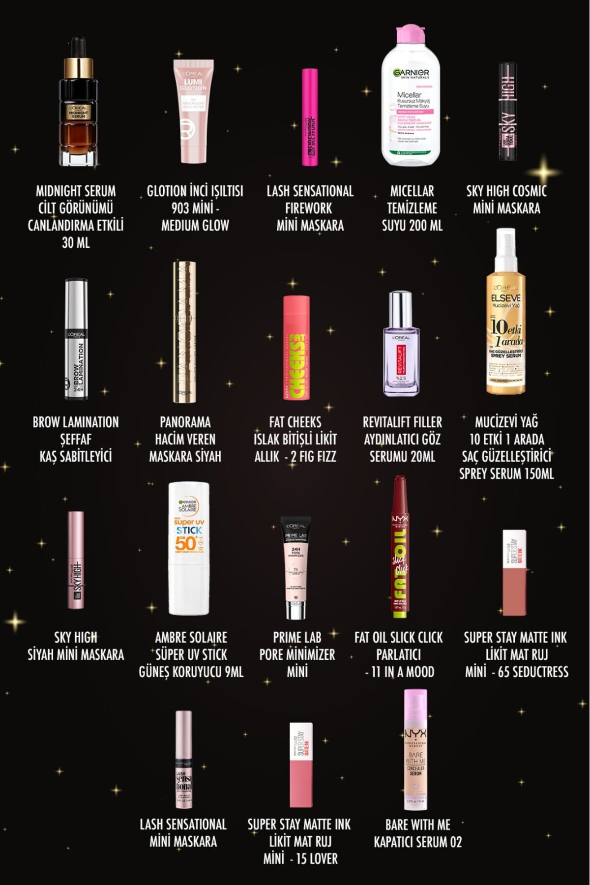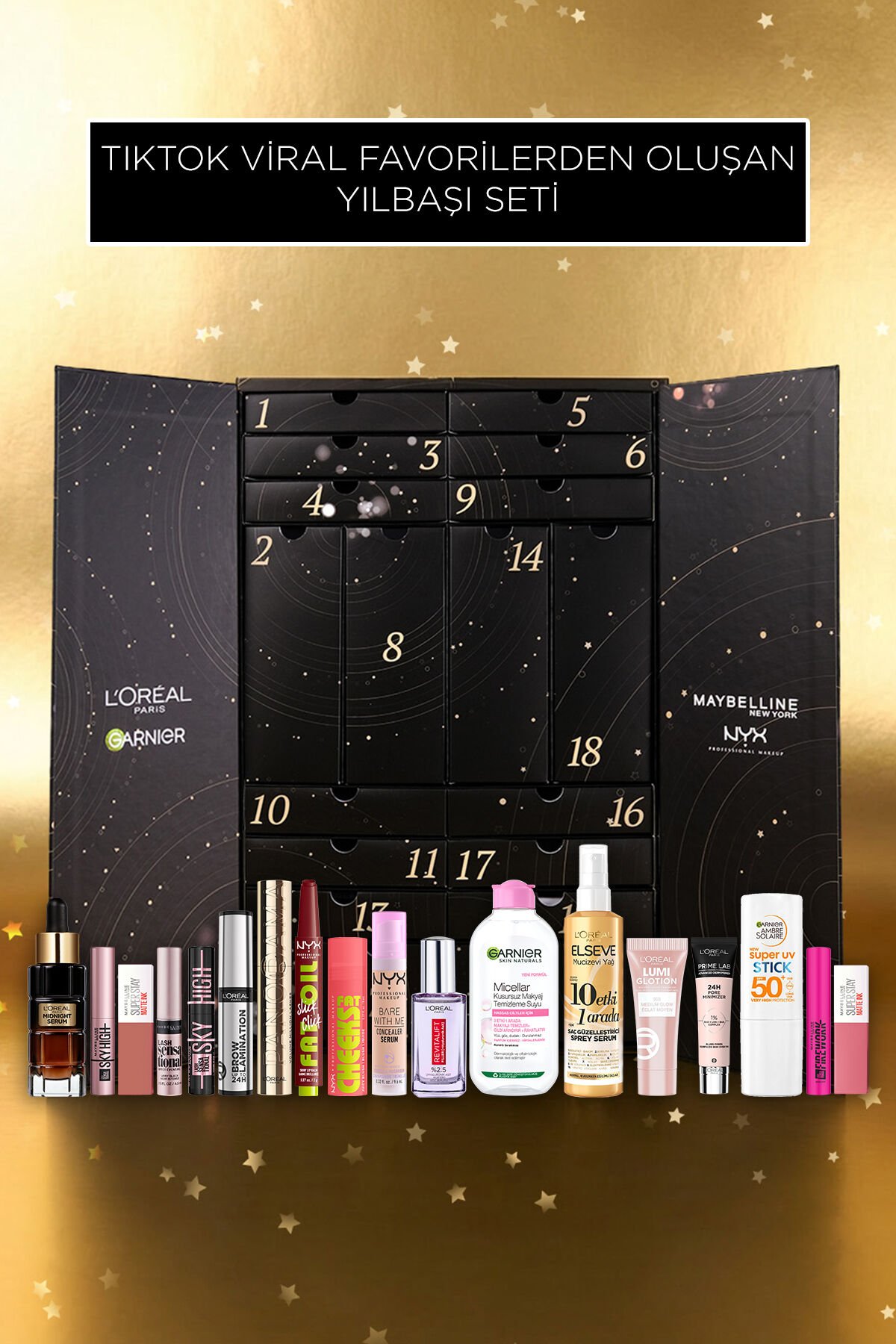 Yılın en büyülü dönemini güzellik dolu bir sürpriz yolculuğuna dönüştürmek için hazırlanan bu özel Advent Calendar, sevilen ürünlerini tek bir koleksiyonda bir araya getiriyor. Her bir kutu, farklı bir günün heyecanını yaşatacak şekilde özenle seçilmiş makyaj, cilt bakımı ve saç bakım ürünleriyle dolu. ; ; Işıltılı maskaralardan ikonik rujlara, cilt bakım serumlarından temizleme ürünlerine kadar geniş bir yelpaze sunan bu set, günlük rutininizi zenginleştirirken aynı zamanda yeni favorilerinizi keşfetmenizi sağlar. Güzellik severler için tasarlanan bu takvim, hem kendinizi şımartmak hem de sevdiklerinize unutulmaz bir hediye sunmak için mükemmel bir seçimdir. ; ; Her gün yeni bir kutu açarak sürprizlerle dolu 18 günlük güzellik deneyiminin tadını çıkarın. Limitli sayıda üretilen bu özel Advent Calendar, yılbaşı döneminin en özel hediyesi olmaya aday! ;İçindeki Ürünlerimiz;;- NYX Professional MakeUp Bare With Me Kapatıcı Serum 02 Light Concealer;- L'Oréal Paris Revitalift Filler Aydınlatıcı Göz Serumu 20ml;- NYX Professional MakeUp Fat Oil Slick Click Parlatıcı Nemlendirici Nude Tonlu Dudak Balmı - 11 In a Mood;- L'Oréal Paris Panorama Hacim Veren Maskara Siyah;- L'Oréal Paris Infaillible 24H Brow Lamination Şeffaf Kaş Sabitleyici;- Maybelline New York Sky High Cosmic Mini Maskara 4.8 ML;- Garnier Micellar Temizleme Suyu 200 ml;- Elseve Mucizevi Yağ 10 Etki 1 Arada Saç Güzelleştirici Sprey Serum 150ml;- Maybelline New York Lash Sensational Sky High Mini Maskara 4.5 ML;- L'Oreal Paris Glotion All-ın-one Doğal Işıltı 903 Mini - Medium Glow;- Maybelline New York Super Stay Matte Ink Unnude Likit Mat Ruj Mini - 65 Seductress 2.7 ML;- Maybelline New York Sky High Siyah Mini Maskara 4.8 ML;- Maybelline New York Lash Sensational Firework Mini Maskara 4.5 ML;- L'Oréal Paris Midnight Serum Cilt Yenileme & Cilt Görünümü Canlandırma Etkili- 30 ML;- Maybelline New York Super Stay Matte Ink Likit Mat Ruj Mini - 15 Lover 2.7 ML;- Garnier Ambre Solaire Super UV Stick Güneş Koruyucu 9 ML;- L'Oréal Paris Prime Lab Pore Mini 10 ML;- NYX Professional MakeUp Fat Cheeks Islak Bitişli Likit Allık - 2 Fig Fizz