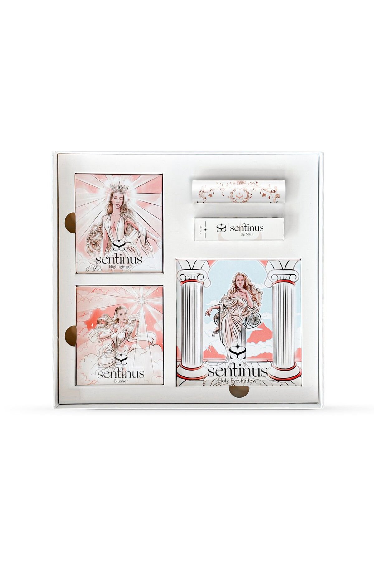 Makyajını tamamlamak için ihtiyacın olan her şey bu pakette.; My Turn Ruj ; Rich Blusher ; Heavenly Highlighter ; Holy Far Paleti ; - Estetik ve şık tasarımıyla dikkat çeken Sentinus Beauty Kit, kişisel bakım rutininizi tamamlamak için ideal bir seçenektir.; - Ürün, yüksek kaliteli malzemeler kullanılarak Türkiye'de üretilmiştir, bu sayede yerel üretim desteklenir ve kalite güvencesi sağlanır.; - Sentinus Beauty Kit, hem ön hem de arka tarafında yer alan detaylı görsellerle ürünün içeriğini ve kullanım alanlarını kolayca tanımanızı sağlar.