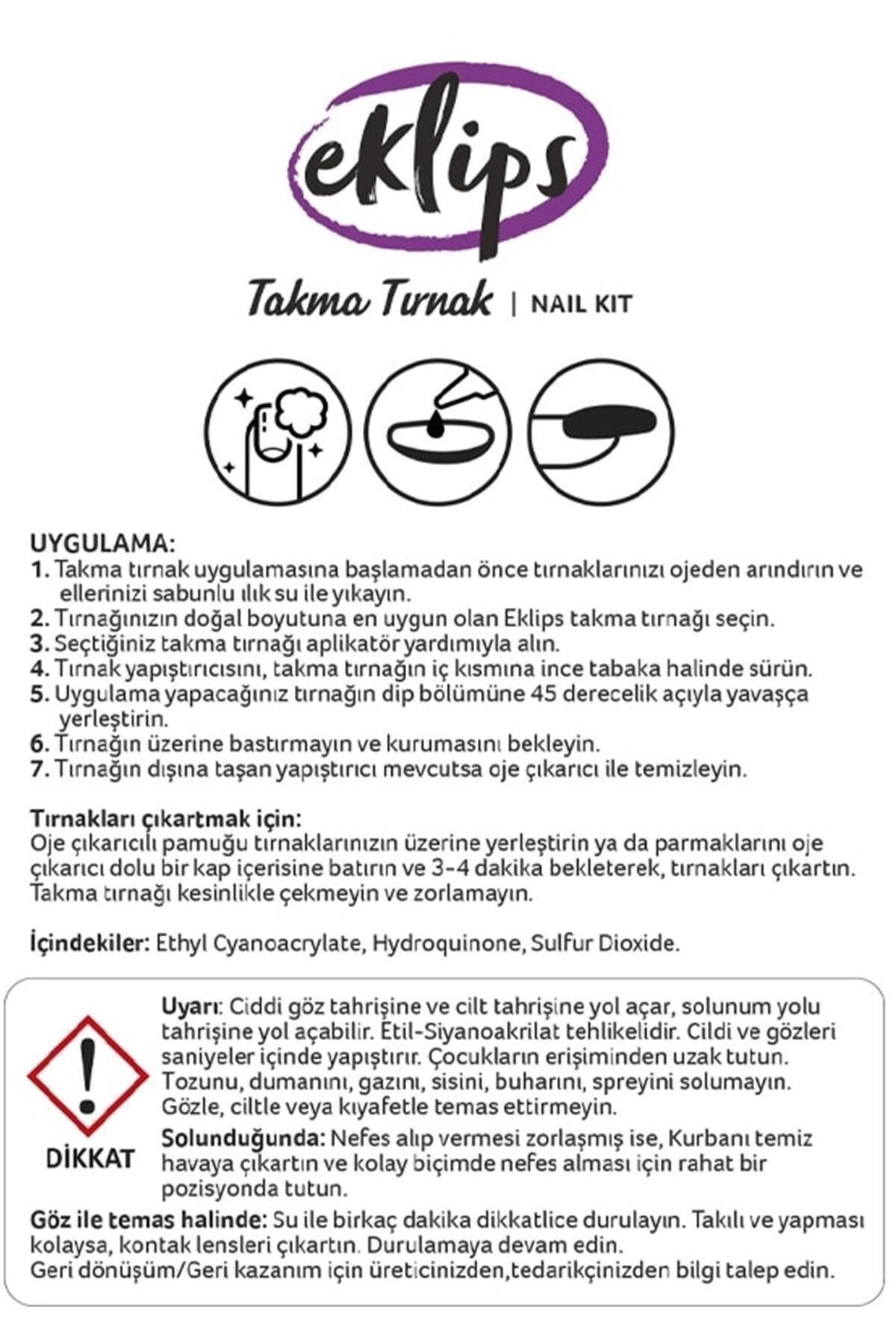 Eklips Takma Tırnak Oval Daha bakımlı ve hoş görünen ellere sahip olmanın pratik yollarını sunan takma tırnaklar son yıllarda giderek popülerleşiyor. ; 12 farklı ölçü seçeneği ile 24 adet takma tırnak, 1 adet yapıştırıcı ve uygulama konforu sunan 1 adet vantuzlu aplikatör ile sunulan Eklips Takma Tırnak Oval zarif görünümü, uzun süre dayanıklılığı ve kolay uygulanması ile kullanıcılarından tam not alıyor. ; Eklips Takma Tırnak Oval Kullanımı • Uygulama yapılmadan önce varsa tırnaklardaki oje çıkarılmalı, eller ılık su ve sabunla yıkanmalıdır. ; • Tırnağın boyutuna ve yapısına en uygun takma tırnaklar belirlenmelidir. ; Seçilen takma tırnak aplikatör kullanılarak alınmalıdır. ; • Takma tırnağın iç kısmına yapıştırıcı ince bir katman halinde sürülmelidir. ; Takma tırnak uygulama yapılacak tırnağın dip kısmına yaklaşık 45 derece açı ile nazikçe yerleştirilir. ; • Yerleştirme tamamlandıktan sonra kuruması beklenir. ; Tırnak kenarına bulaşan yapıştırıcı varsa temizlenir. ; • Çıkarılmak istendiğinde takma tırnağın çekilmemesi gerekir. ; Takma tırnak zorlanmamalı, oje çıkarıcı pamuk kullanılarak ya da parmaklar oje çıkarıcı ile dolu kap içerisinde 3-4 dakika bekletilerek tırnaklar çıkarılabilir.;